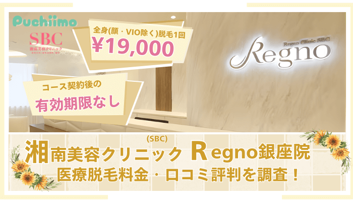 湘南美容クリニック(SBC)Regno銀座院の医療脱毛について、プチーモ編集部が口コミ・レビューを独自に調査しました。