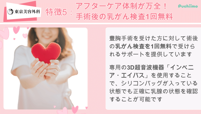 東京美容外科では、豊胸手術を受けた方に対して術後の乳がん検査を1回無料で受けられるサポートを提供しています。