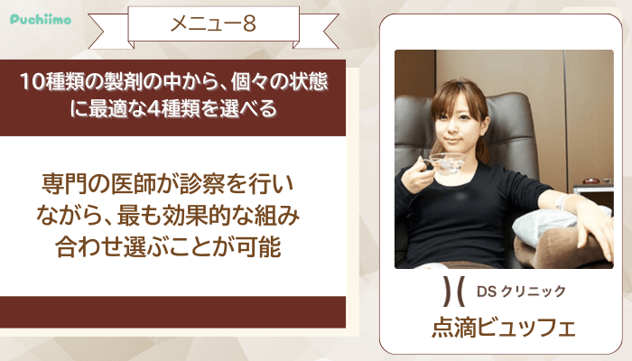 「点滴ビュッフェ」は、10種類の製剤の中から、個々の状態に最適な4種類を選び出し、組み合わせて使用します。